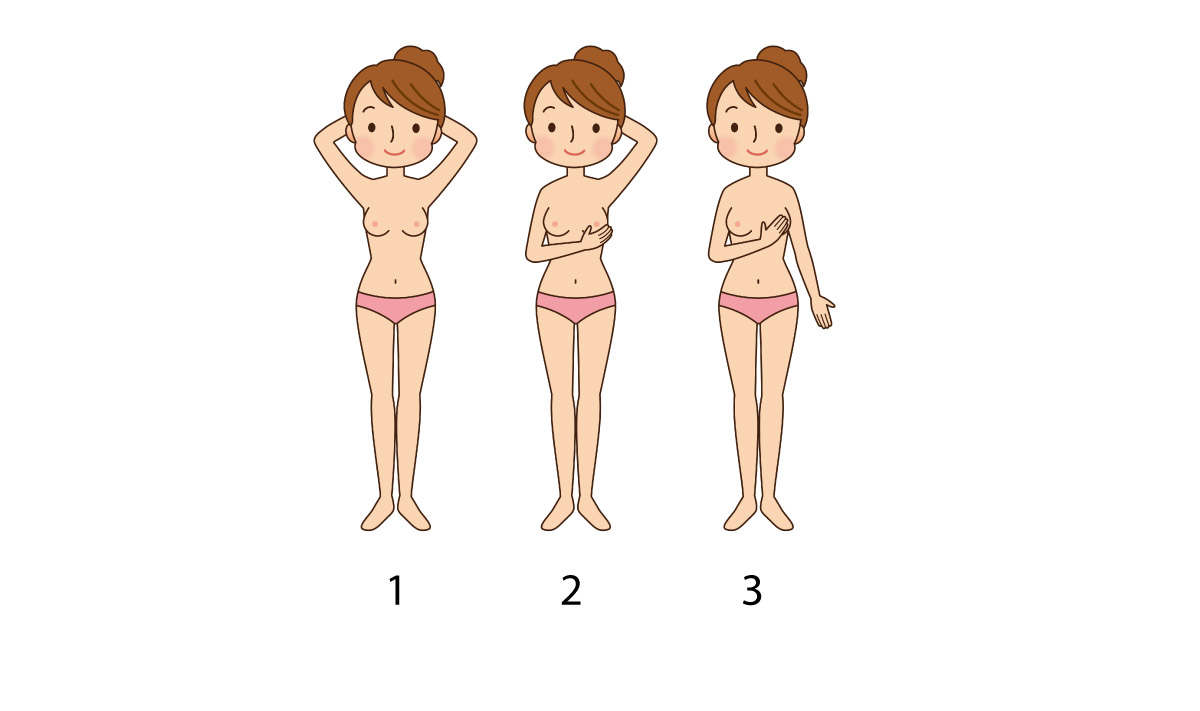 2. Закинь ліву руку за голову. Пальцями правої руки акуратно обмацай ліву грудь, рухаючись по спіралі – від пахви до соска, по вертикалі – зверху вниз. Повтори ті ж дії з правою груддю.